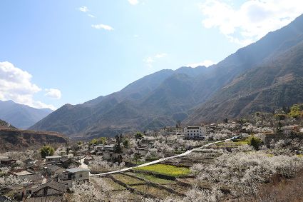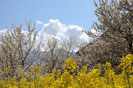 在瀘定縣冷磧鎮、德威鎮等地,桃花、油菜花及櫻花競相開放,一團團、一簇簇,綴滿枝頭,藍天、白云與各色花兒相交,金黃花海在微風中起伏。一畦畦油菜花田錯落有致、層次分明,綿延不斷。“二月櫻花開,三月桃花盛,四月紅櫻桃,五月水蜜桃。”除了油菜花,每年陽春三月,瀘定的桃花也隨著和煦春風落滿枝頭滿樹的花芽沁著香氣,一點點溢到空氣中,香了春風,也香了整座城。