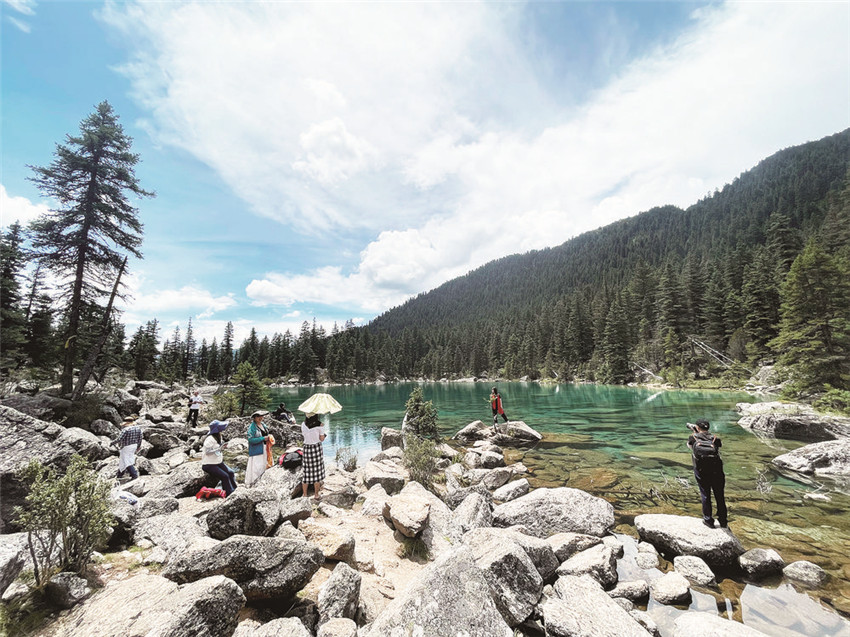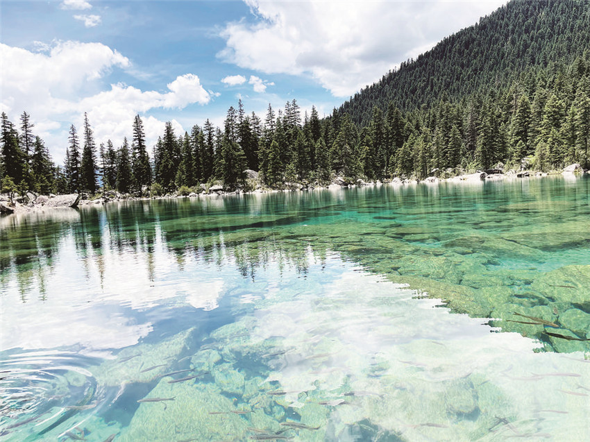 措普溝匯集了山川景物的精華,雪峰、冰川、原始森林、湖泊、河流、峽谷、瀑布、溫泉、草原、野生動植物、藏族風情。特別是被雪山半環繞的措普湖,有山有水,顏色層層遞進,清澈見底,在陽光的折射下波光粼粼。