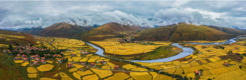 從立秋開始,陽氣漸收,萬物內斂。在希望的田野上,主色調也從象征繁茂、成長的翠綠向代表成熟收獲的金黃漸變。爐霍縣蝦拉沱鎮,藏房零星地點綴在田野間,成熟的農作物漸染了整個秋季,讓這個小村莊如同一幅色彩斑斕的油畫。