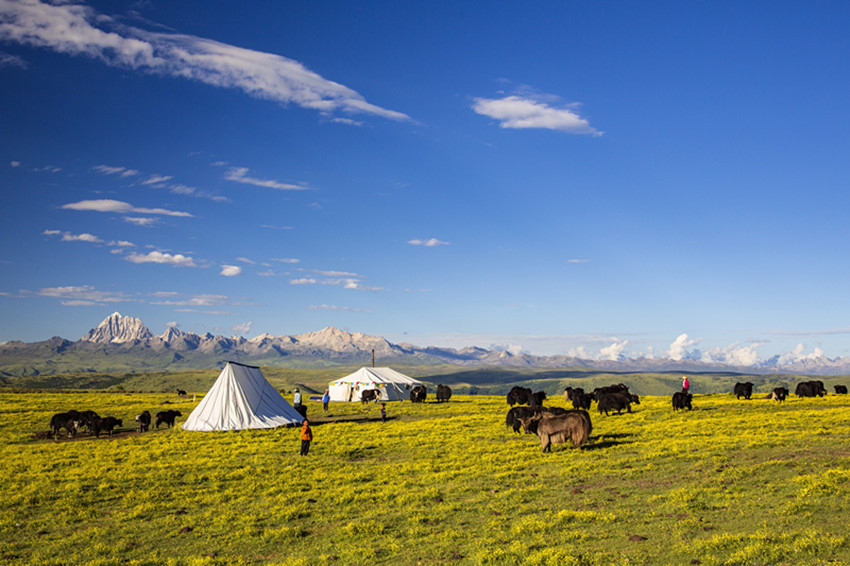 然后行走在山水之間,擁抱大自然,尋找屬于自己的“詩和遠方”。油綠的青稞、小麥,散發出濃郁的田園風味;天邊群山起伏,磅礴的氣勢瞬間感覺人在自然面前實在太渺小;帳篷點綴著開滿野花的牧場,牦牛哞鳴,一片生機,細細體會牧民“逐水草而居”的生存智慧......
