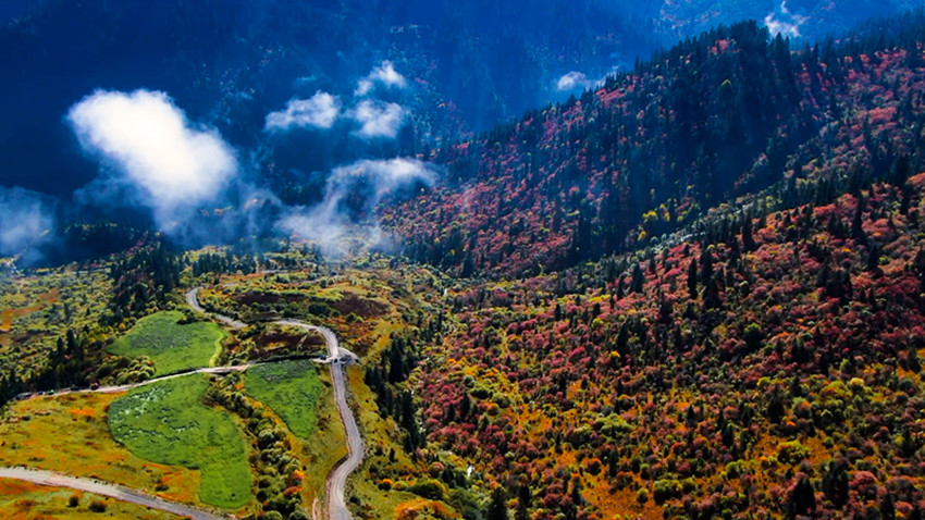 時光不語,偷施魔法,大自然手持五彩的紅、黃、藍、綠、白調色盤,將道孚的秋天潑灑成童話的世界。