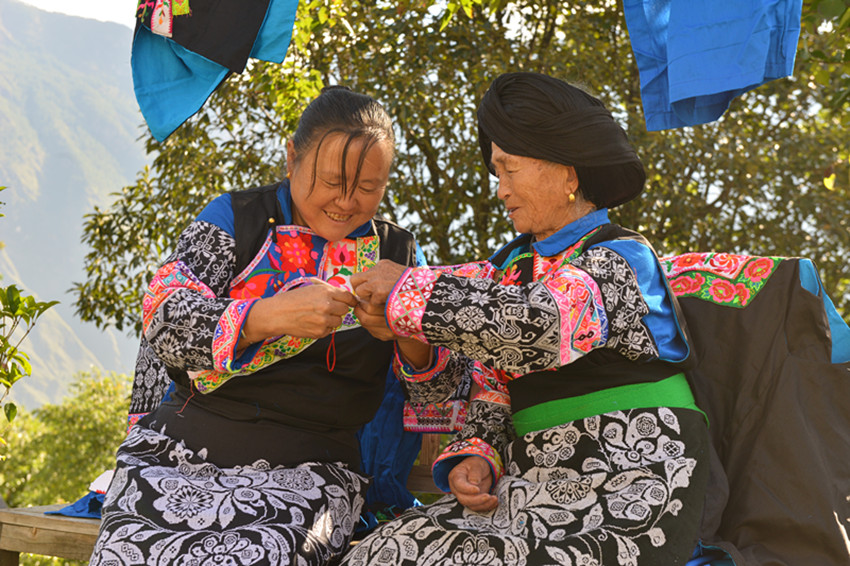 今年76歲的周光芬老人,是魁多鎮第五代刺繡制作技藝非遺傳承人。居住在九龍縣魁多鎮里伍村,老人身著傳統的客家服飾,在自家的院壩里編織布料,溫暖的陽光照著老人。
