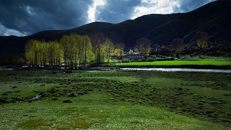 湛藍的天空下,雄鷹在盤旋,牛羊在安詳地漫步吃草,靜靜的小河在山邊蜿蜒流淌,充滿綠意的白楊樹在風中搖曳,藏式民居不時升起縷縷炊煙,寂靜、空曠的原野深處偶爾會傳來幾聲狗叫高原的陽光又賦予這幅風景畫凝重的色彩這樣的畫面叫人心醉,讓人留戀忘返從折多山腳下至新都橋鎮,再至塔公草原,處處都是入畫的美景,不愧稱為“攝影家的天堂”。