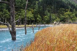 這里森林茂密,河流縱橫,生態原始,很多古樹浸泡在河水、沼澤之中,姿態怪異,神秘莫測,猶如置身侏羅紀時代。傳說這里是東巴神話《創世紀》的發祥地。