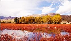 蔚藍蔚藍的天空飄著幾朵淡淡的白云,天空是那么近,仿佛你伸手可觸。一出縣城,你可以看到世界上海拔最高、面積最大的人造青楊林,這兒的海拔是三千七百多米,農業學家認為海拔4000米是不能生長農作物的,可是這里照樣是郁郁蔥蔥,到處是風里閃爍的青楊樹,映著灘寬水淺的小河,炊煙裊裊的藏房,潔白豐滿的佛塔,還有色拉村的晨霧,好一派迷人的美景……