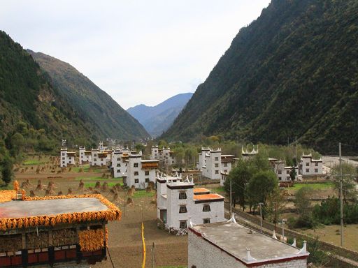走進冬日的丹巴縣革什扎鄉(xiāng)三道橋村,一幅如詩如畫的鄉(xiāng)村美景映入眼簾:一排排新穎別致而獨具嘉絨特色的白色藏房鑲嵌在彎彎的革什扎河旁,格外耀眼。一條條平直寬敞的硬化路像一根根潔白的哈達連接家家戶戶,寬敞平坦的公路上,轎車、農(nóng)用車、拖拉機穿梭來往,別具一格的村民活動中心紅旗迎風(fēng)飄揚。 這是如今的三道橋民族團結(jié)新村。