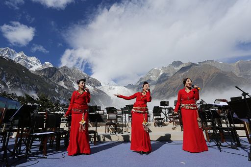 四號營地,晴空萬里、風和日麗,清澈的高原天空藍得澄明醉人,來自四川交響樂團和民間的200多位樂手共同在海拔3500米的冰川瀑布之下演奏了《青藏高原》、《向往神鷹》、《菊花臺》等歌曲。