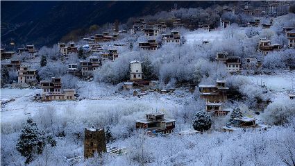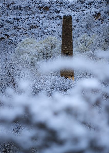 我以這份孤獨和執著,爬上了東邊的山坡。雪停了,微風習習。櫻桃花、桃花在雪枝頭冷艷,淡淡的幽香徐徐浸入心扉。滿眼望去,一片晶瑩,一片潔白。古碉藏寨在這片世界里,寧靜安詳,不容一絲一毫的驚擾。我懷疑自己進入了那種叫做空靈的境界。