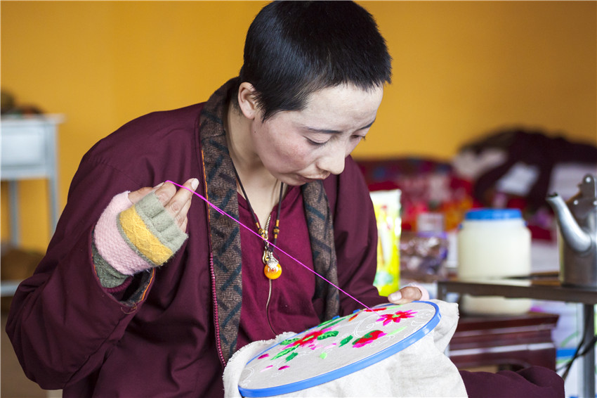 行攝途中經過塔公鎮扎西寺,遇見康定市婦聯邀請到的中國國家級非物質文化遺產藏羌織繡傳承人,正在為自愿報名的數十名覺姆傳授藏繡圖案基礎知識、藏繡圖案的常見表現形態、挑繡、納花繡、鏈子扣、扎花、提花、拼花、勾花和手繡等各種繡法技能。佛教的學習本是無止境的,我被這安靜、專注的場景深深感染,按下相機快門的一瞬就記錄了朵朵盛開在指尖的蓮花。
