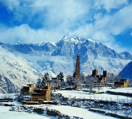 白雪皚皚,窗明幾凈,陽光從高山傾瀉而出。丹巴正沐浴著冬日的陽光,一幢幢外形美觀,風格統一的寨房依著起伏的山勢迤儷而建,高高低低,錯落有致,與周圍清澈的溪流,皚皚的雪峰,構成一幅田園牧歌式的優美的鄉村畫卷。