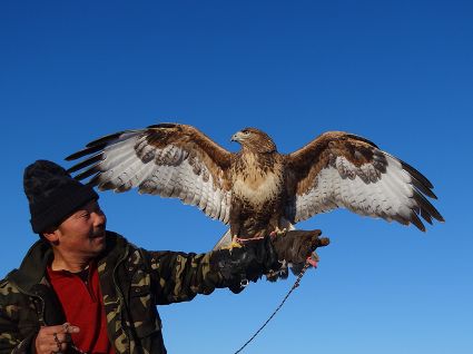 “小一點的鷹好訓,訓老一點的叫熬鷹。 開始熬鷹前,一次性喂飽鷹,七天七夜不吃不喝不睡覺,待七天時到,放鷹于空,手中拿肉,用我們倆特殊的交流方式指揮它,這時它會落我的手臂上。但是,這一只始終沒服過我。訓出來一只大約半月左右。”訓鷹人說。