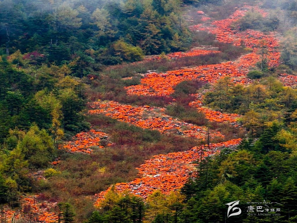 翻越雅家埂啞口的路是一條盤山路。十幾年前我就走過這條路,那時被我驚鴻一瞥的紅石頭,規模不大,現在對面山脈上一條叫黑溝的河谷中的紅石灘煞是壯麗。當車盤旋而上的時候,在路上任何一個地點停車,都是最好的觀景臺。奇麗的紅石灘從一座雪山上蜿蜒而下,好像一道紅地毯從雪山翠柏中鋪下來,地毯上編織著圖畫:河流分分合合,云杉斑斑點點遺憾的是河谷后面的雪山被雨霧遮掩著,始終沒有露面。