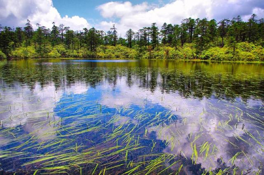繼續前行,下一站既是木格措。木格措漢名:野人海,水源來自于身后女媧雪山的積雪融水,水質清冽,能見度極高,湖四周群山環抱,紅海、黑海、白海等幾十個小海子圍繞在周圍,如眾星拱月般。木格措風光秀美,“臥虎觀月”、“雙霧墜海”等景觀最為獨特。