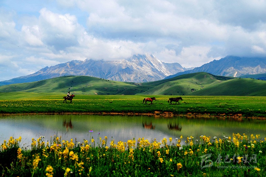 夕陽照耀湖水,閃著金銀光;綠樹撐著青天,到處莽蒼蒼;牧民家的房子,五彩斑斕樣;藍色天空之上,白云在飄蕩;青石河岸之畔,繽紛百花香……這里是寫生的圣殿,這里有攝影的天堂,這里是讓人魂牽夢縈的夢里仙鄉。