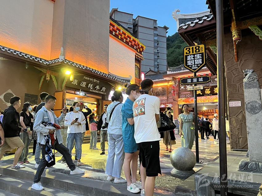 隨著夜幕降臨,在網絡上熱度不減的康定夜景逐漸展現,游客們漫步折多河畔,感受避暑勝地帶來的涼爽。