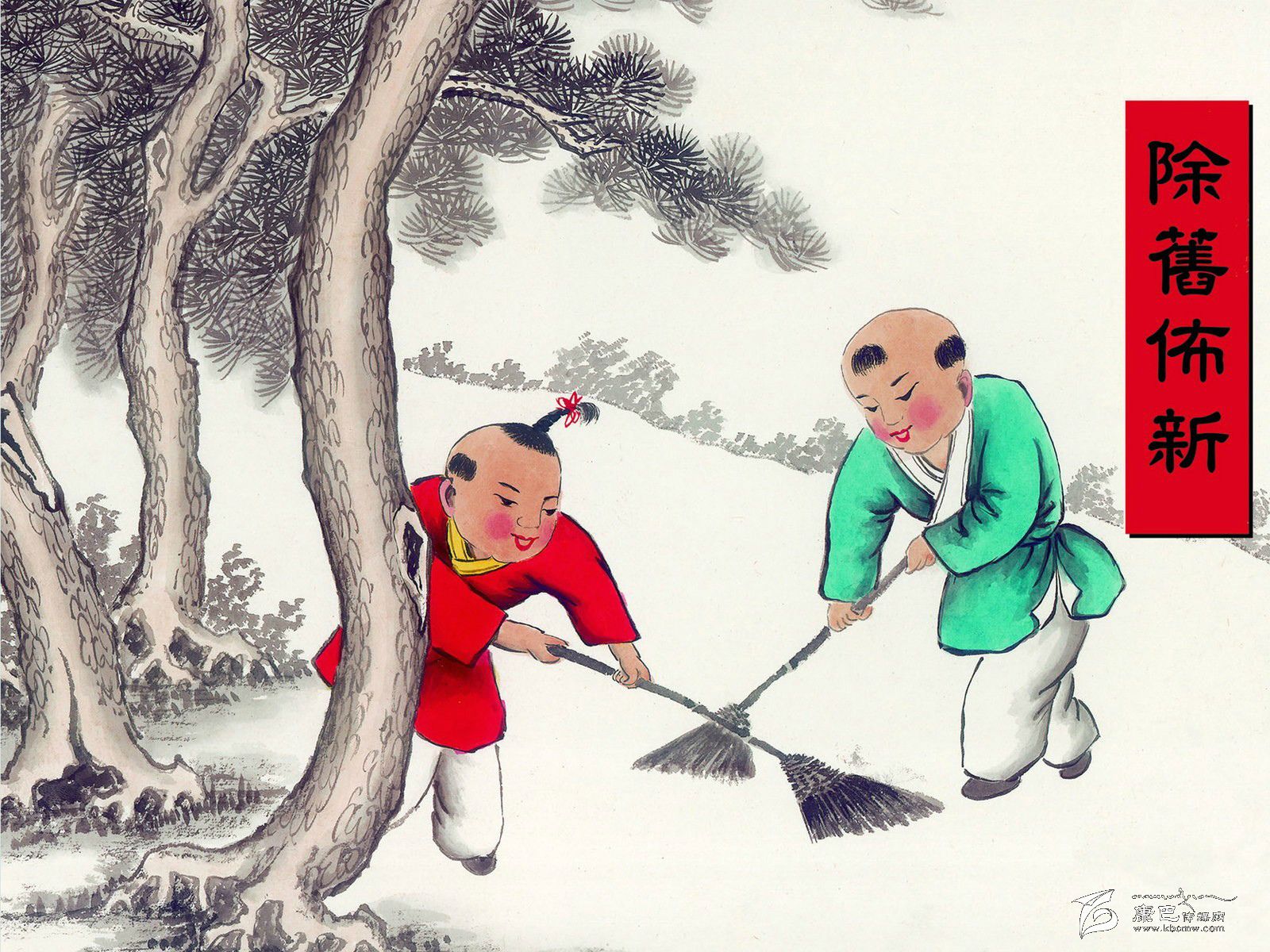 舉行過灶祭后,便正式地開始做迎接過年的準備。每年從農(nóng)歷臘月二十三日起到除夕止,我國民間把這段時間叫做“迎春日”,也叫“掃塵日”。掃塵就是年終大掃除,北方稱“掃房”,南方叫“撣塵”。在春節(jié)前掃塵,是我國人民素有的傳統(tǒng)習慣。每逢春節(jié)來臨,家家戶戶都要打掃環(huán)境,清洗各種器具,拆洗被褥窗簾,灑掃六閭庭院,撣拂塵垢蛛網(wǎng),疏浚明渠暗溝。大江南北,到處洋溢著歡歡喜喜搞衛(wèi)生、干干凈凈迎新春的氣氛。