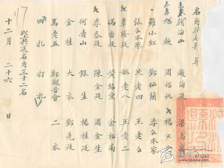 不準賭博做什么呢?當時的當權者還是費了一番心思,他們從外地請來了一個川戲班子,為了吸引人們關注,康定縣政府把戲班的名角以及配角演員名單寫成海報張貼到街頭,又抄成傳單廣為散發,用現在的話說是,做足了戲班出場前的前期宣傳工作。從名單上看,這是一個不小的戲班子,所謂名角竟有32名之多。想來對于沒有多少文化生活的康定民眾,還是有一定的吸引力。
