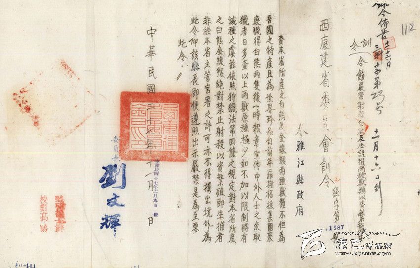民國27年(公元1938年),“西康省建省委員會”發出“經字第1287號”訓令,這是一份難能可貴的保護野生動物的訓令,訓令說:“查本省所產之白熊及金線猴兩種獸類,不但為吾國之特產,且為世界珍品。自前年羅斯福采集團來康獵得白熊兩只后,一時報章宣傳,中外人士之來取獵者日多。查以上兩獸原種極少,如不加以限制,將有滅種之虞。茲依照狩獵法第四條之規定,對本省所產之白熊、金線猴絕對禁止射殺,以資繁殖。即生捕者非經本省主管官署之許可,不得帶出境外。為此令仰該縣長即便遵照出示嚴禁是為至要,此令。”訓令最后署有“西康建省委員會委員長劉文輝”的簽名。