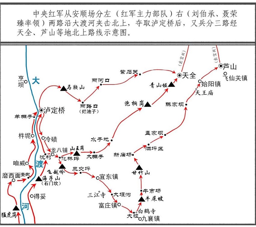 關于紅軍離開瀘定后的具體行軍路線,聶榮臻同志后來曾經回憶:“我全軍過大渡河后,開始想回過頭來,南向清溪、富林,以扼阻中央軍渡河北上,所以我們1軍團又在化林坪等地擊潰退守第二線的四川軍閥河防部隊。以后軍委得知清溪有川軍守敵四個旅,為了避免與敵糾纏,盡快與四方面軍靠攏。又命令我們繼續北上去占領天全、蘆山。”5月31日,飛奪瀘定橋的紅2師4團不顧連日行軍作戰的疲勞,從瀘定趕到飛越嶺下,攻打飛越嶺。飛越嶺位于瀘定縣東南,是漢源和瀘定的分界地,海拔近3000米。山頂有一隘口,稱為飛越關。此關是瀘定能往漢源、滎經的道路,也是紅軍北上的必經之地。6月1日清晨,紅軍發起對飛越關敵軍陣地的偷襲戰,在付出30余人傷亡的代價后,成功占領了飛越關。