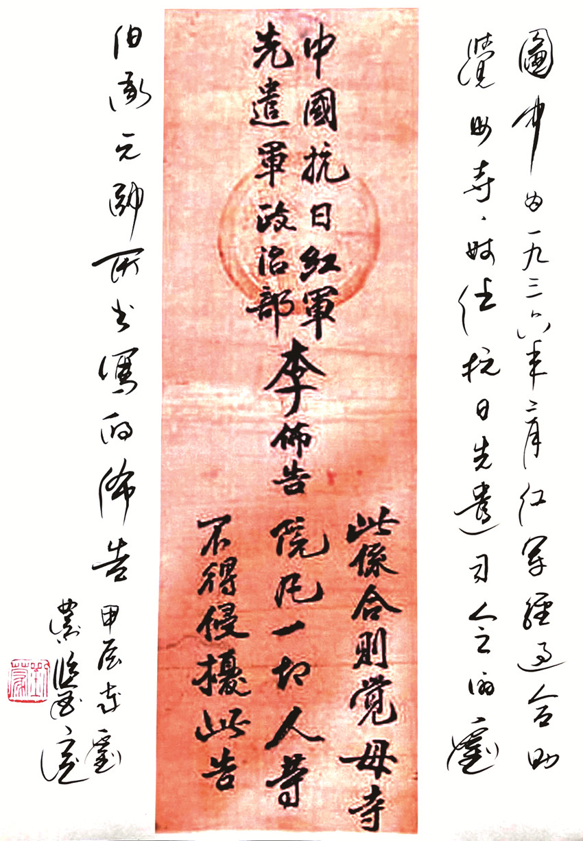 該布告和其他的布告在書寫形式上有所區別,不是現在常見的橫向的,是豎向的,按照上中下分三部分,發布方、責任人、發布內容。它的落款也就是發布方的單位在上面,左右對稱,蓋章可以辨認為:中國工農紅軍第四方面軍第三十軍政治部。中間是發布人李先念的姓李,比其他字大一倍,以示突出。在下方是布告的內容。書寫者以行書書寫,一氣呵成,整體結構勻稱,字體大小適中,內容簡明扼要。布告歷經多年,保存完好,說明寺院的收藏者對布告的內容認可,對書寫者書法充滿敬意。