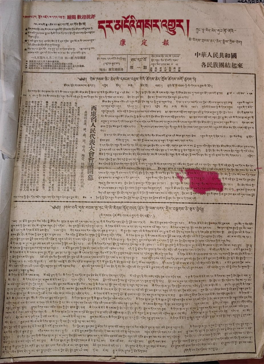 1954年12月以前出版的《康定報(bào)》,刊期不定,版數(shù)不定,刊期長時(shí)達(dá)17天一期報(bào)紙,短時(shí)7天一期報(bào)紙;版面有時(shí)是對開四版,有時(shí)是對開二版。1954年12月10日以后,基本上能十天出一期報(bào)紙,1955年1月以后改為周刊。西康省與四川省合并后,經(jīng)四川省委宣傳部批準(zhǔn),《康定報(bào)》從1956年1月起,正式改為周五刊。改刊初期,每期報(bào)紙每個(gè)版都用藏、漢文對照排版。后來又改為藏、漢文分別組版,即一、二、三版為藏文,四版為漢文。