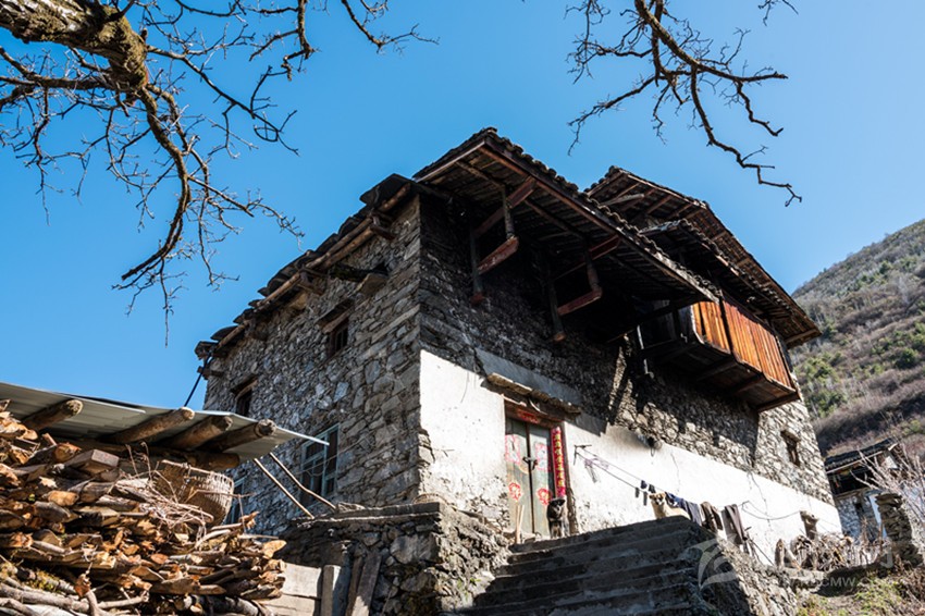 魚通人的房屋符合古人對居所背山面水的要求,多依山而建。房屋為木石混合結構,以片石木材和黃泥為主要材料建成,當地人稱之為“碉房”。房屋用石塊壘起,以木頭為墻筋,每隔一定高度,橫砌進入石塊,融為一體,使之更為堅固牢靠。“碉房” 一般為三層或四層,呈四角或六角形。底層為關牲畜。第二層為“堂屋”, 在過去,是集做飯、吃飯、烤火、家人日常活動為一體的場所,地上設有火塘、灶,并在火塘上設石制三腳鍋莊或鐵三腳。第三層為各居室,有的設有貯藏室和會客屋。頂層為經堂,室外為曬壩,作打場、曬場用。有些在外側設有一小吊腳樓,可堆放雜物。隨著時間的流逝,古老的碉房已無法滿足現在居民的需求,已很少有人居住,而新式碉房在傳統的基礎上開始出現。