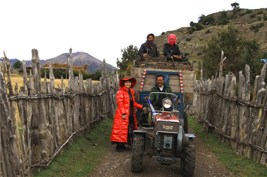 不久雨停下來,山邊露出一縷陽光,天空又是一片碧藍。我們趕緊繞道藍湖驛站后面的牧場上,發現一座臨時搭建的軍用鐵橋可是通向一個小島。走過去,島上景色更美,遠處雪山冰川倒影晶瑩碧藍的水中,近處綠樹滿山,草場上牛羊星星點點。島上的小村莊叫阿日村,住著十幾戶人家,青稞剛收獲完畢,男人正忙著把牛羊過冬的草料堆積在高高的木架子上,女人除了撿牛糞外,還要準備冬天取暖的柴薪。雖然村民大多不能講漢語,但對陌生人通常會含笑致意,一個小伙子還用結結巴巴的漢語重復了兩遍“喝不,青稞酒?”。我們到村民達娃卓瑪家,她是家里四個孩子中的老大,今年二十二歲,最小的弟弟不到五歲。她上過三年小學,能講一點漢語,臨時充當家人的翻譯。父母和奶奶見有客人來,非常熱情,立馬打酥油茶,并端上一盤奶渣,因為不會講漢語,只好不停招呼我們“吃,多吃”。家里的客堂兼經堂寬敞干凈,廊柱和供案施以彩繪,供案上擺放兩個活佛的一尺見方的照片,前排供了酥油燈、糌粑和清水。
