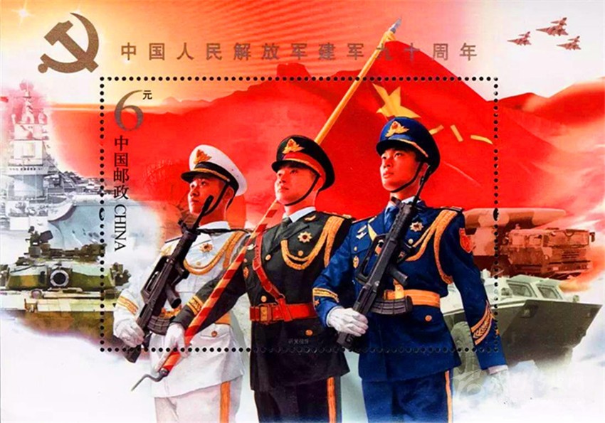 2017年8月1日,中國郵政發行《中國人民解放軍建軍九十周年》紀念郵票小型張“聽黨指揮”(圖8)。郵票畫面上“八一”軍旗飄揚,各軍種英姿颯爽,背景襯托各軍種高尖端裝備,描繪了我軍戰士聯合作戰的畫面,既表現了中國人民解放軍威武雄壯的軍容和現代化水平,也表現了在黨的指揮下,人民軍隊忠實履行保衛祖國、捍衛和平的神圣使命。