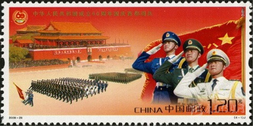 2009年10月1日,中國郵政發行的《中華人民共和國成立60周年國慶首都閱兵》紀念郵票一套4枚。其中第1枚“徒步方隊”(圖6),圖案為中國人民解放軍三軍儀仗隊執旗手和護旗手在軍旗下行軍禮。