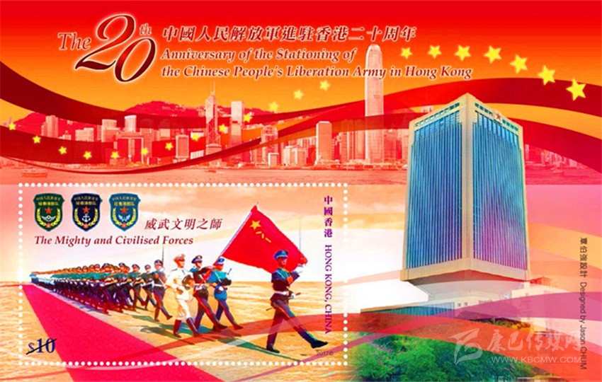 2017年6月20日,香港特別行政區郵政局發行了《中國人民解放軍進駐香港二十周年》郵票小型張“威武文明之師”(圖7)。郵票主圖展示的是在“八一” 軍旗引導下,中國人民解放軍陸、海、空三軍儀仗隊的威武風采。