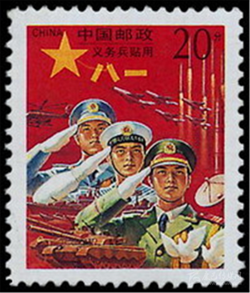 1995年8月1日,原郵電部試發行一套“義務兵專用”郵票一套1枚(圖5),票名為“神圣的使命”,圖案以紅光四射的“八一”軍旗為背景,以現代化的飛機、坦克、火箭和象征和平的白鴿為襯托,畫面是威武的陸海空三軍,顯示我軍鋼鐵長城般功無不克、戰無不勝的精神風貌。