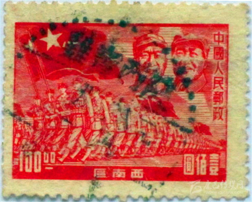 我國最早出現“八一軍旗”的郵票,是1949年8月1日, 剛解放的上海華東人民郵政發行的《中國人民解放軍建軍22周年》俗稱《華東進軍圖》郵票(圖1),一套5枚,同圖異色異值,郵票右上方為毛澤東主席和朱德總司令頭像,下方是鐵流般的人民軍隊高舉著一面面“八一軍旗”。 同年12月,西南區人民郵政又發行一套11枚圖案相同“西南進軍圖”郵票(圖2)。