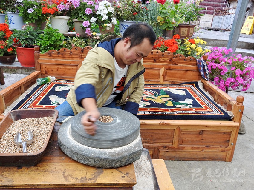 扎呷介紹說:水淘糌粑的制作工藝非常講究,分四步。首先要選用優質青稞風干篩好,放入山泉水中洗凈、曬干,再用熱水淘洗,瀝干水分趁熱裝人麻袋密封,保持恒溫,放上一夜。第二天,燒熱平底大炒鍋,揭開麻袋自然會聞到一股酒香味,然后倒人炒鍋,不停翻炒。炒青稞關鍵要掌握好火候,不焦不生,出現青裸花后就炒好了。待炒好的青稞冷卻后,裝入皮口袋,送到磨房,經水磨磨出的糌粑,粉細、色澤潔白、味香可口。