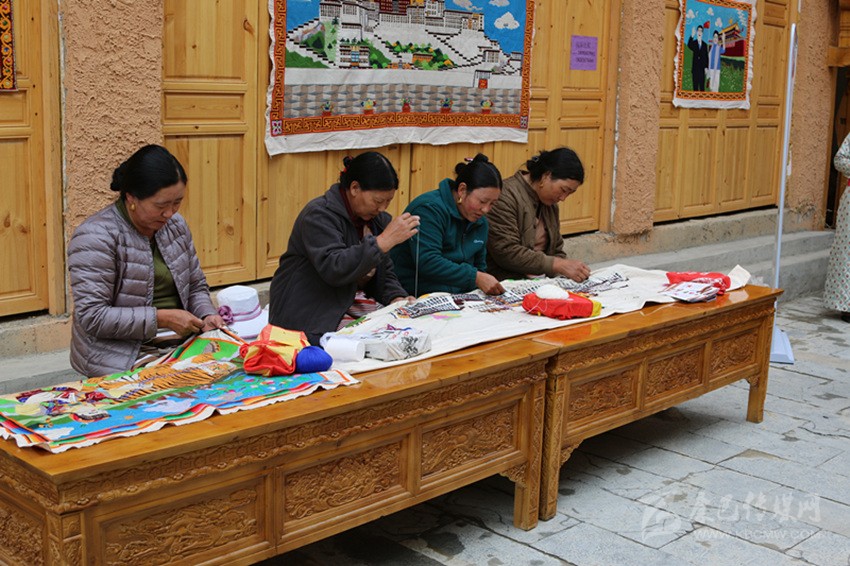 在藏繡展點,5名農牧民婦女正在合繡一幅藏族建筑刺繡作品。“我從16歲開始跟著父親學藏繡,傳到我這已經是第四代了。除了‘六長壽’、度母像等傳統圖案,今年是新中國成立70周年,我還繡了一幅天安門作品。”47歲的傳承人達打介紹道。