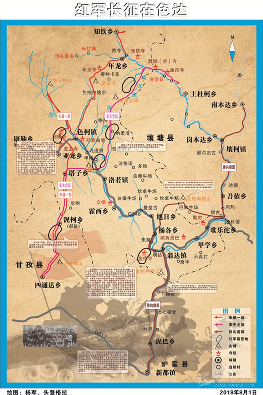●由王建安率領的紅四軍十二師、獨立師于六月二十九日從爐霍蝦拉沱出發,七月三日到達色達。