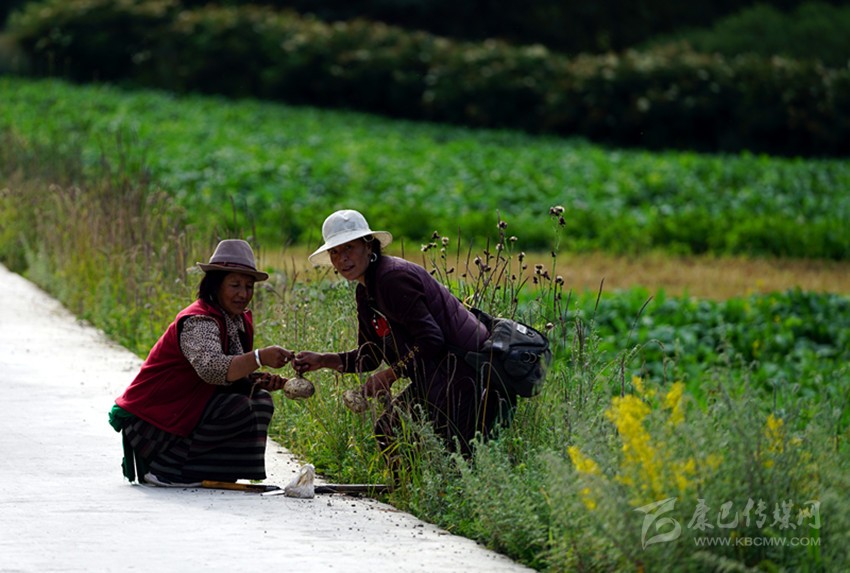 開始收割了,從坡地到川地,到處是收割機的聲音。青稞是車巴溝的主要作物,因為要磨青稞面,要吃糌粑。村里人忙得團團轉,收割機開過去,大家就跟在后面撿穗子。如此往復,一直要到糧食拉到家里。