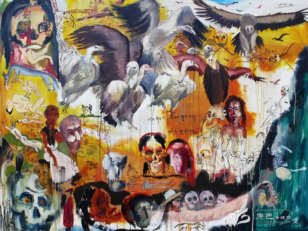 心態的豁達使周韜明確創作風格后,很自然地創作了以藏區文化為主題的油畫系列,比如《沐浴節》、《活佛》、《天葬》、《女孩和她的夢》。比如,在《天葬》里周韜大量使用各種狀態的骷髏,對此他的理解是“從有些人來看,它可能代表了某種邪惡,但是從民族文化和精神層面來理解,它是藏區文化的一部分,也是藏族人對生命的一種觀看方式,比如藏戲和法會中就有專門的骷髏舞。”