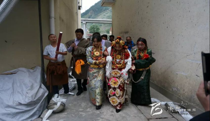 接親。除表現主人的熱情、好客、大方外,還要講究氣派,顯富有、高檔次、高規格。以娶親為例,舉行婚禮的當天,男方要組織數十匹馬隊或高檔汽車接親,披金掛銀,蔟新華麗。接親的馬隊從新娘家出發后,男方要在家或路過人家必經之地設置吉祥物,如盛滿一桶水或鋪一床藏毯、或隨身衣物鋪在地上,當接送新娘的馬隊路過時,接親的人要給吉祥物獻哈達和拋撒銀錢、紙錢和糖果等以示新娘路遇彩頭、沖喜,表示吉祥如意。到男方家后新娘被扶下馬或扶下車,高僧大德頌吉祥詞后,圍繞所放佛像或吉祥八寶圖及裝滿水或牛奶的銅鍋順轉三圈后,踩著從大門口鋪至經堂的藏毯進屋,進入客廳之前新娘只身先進廚房,點燃灶里準備好的柏香紅木或枝葉進行熏煙,據藏醫考證熏香煙對身心健康有益,也可表示從即日起新娘便是男家的主婦了。
