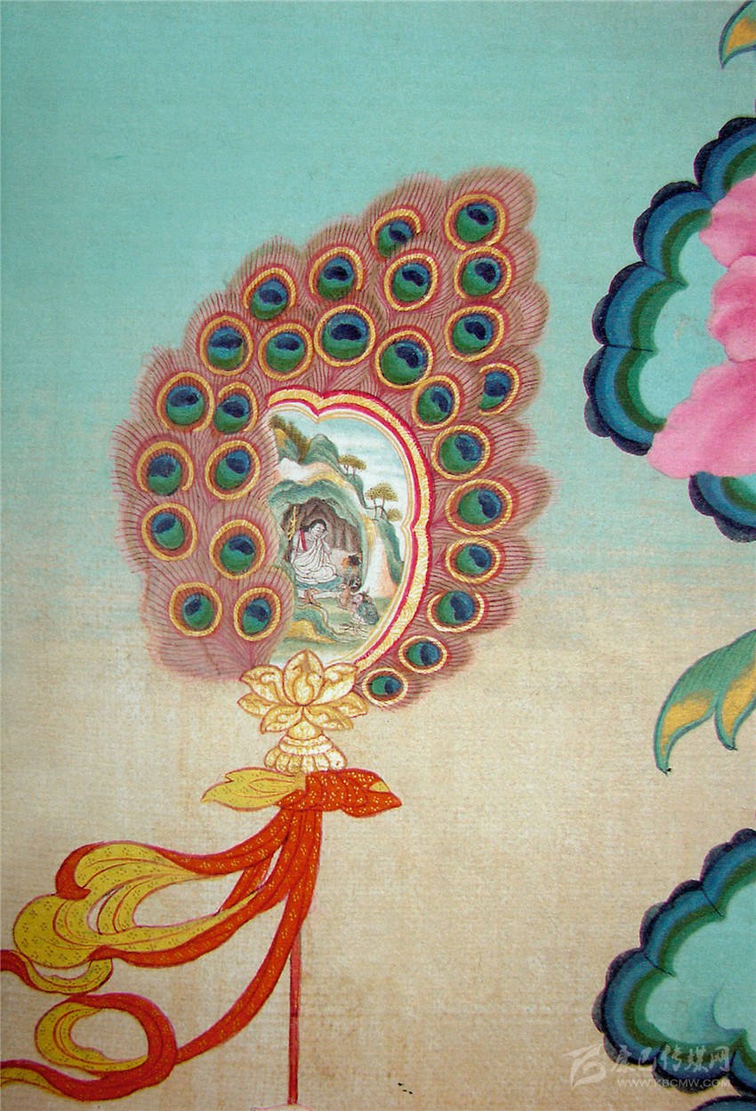 當然,我們可以從存世的作品上印證他的這種能力。比如是在《如意寶藤之釋迦牟尼》中:左側侍女手持一把孔雀羽扇,在羽扇的中央是一塊約四平方厘米的畫屏;在這個小小的空間里面,郎卡杰描繪了一幅微縮的《修行圖》,圖中米拉日巴正在洞中苦修,洞口蹲伏著獵犬、鹿和獵人。畫中動物與人結構準確,五官準確,須發清晰,衣紋細密流暢;山洞上的樹木能區分出樹干和樹葉;天空的白云有遠近層次。在這不足盈寸的空間里,用毛筆刻畫這般細致,令人嘆為觀止。
