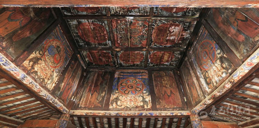 在介紹的過程中,我發現這座小寺不簡單,很想到正殿看看。到了殿里,我發現殿內佛像具備,壁畫、板畫以及唐卡數量眾多,皆是工藝精湛。廟宇四檐有青銅制風鈴4個,但是一樓的壁畫看著像是維修過。