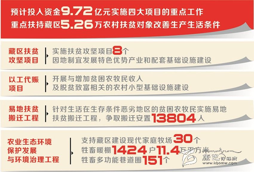 答:比如藏區扶貧攻堅項目,從實施內容來看,今年在阿壩州、甘孜州、涼山州木里縣實施扶貧攻堅項目8個,其中阿壩州3個、甘孜州4個、涼山州木里縣1個,預計投入中央財政專項扶貧資金4000萬元,表面上延續了去年的工作,但今年實施項目將突出兩大要求,一是項目要瞄準今年有計劃摘帽的貧困村、計劃脫貧的貧困戶,集中力量解決突出問題。二是項目資金要到村入戶,因地制宜發展特色優勢產業和配套基礎設施建設,確保精準扶貧。