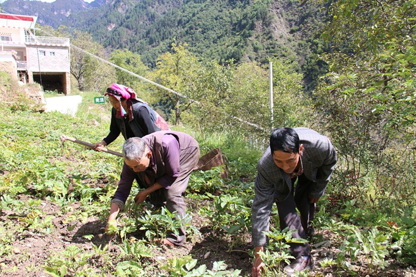 丹巴縣半扇門鄉大邑村駐村第一書記與村民共同勞作。