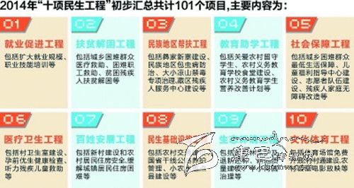 在征求各級(jí)部門、基層群眾意見的基礎(chǔ)上,今年“十項(xiàng)民生工程”已初步匯總101個(gè)項(xiàng)目,主要有:就業(yè)促進(jìn)工程,包括擴(kuò)大就業(yè)規(guī)模、職業(yè)技能培訓(xùn)等;扶貧解困工程,包括城鄉(xiāng)困難群眾醫(yī)療救助、困難職工救助等;民族地區(qū)幫扶工程,包括大小涼山禁毒專項(xiàng)治理、藏區(qū)殘疾人服務(wù)中心建設(shè)等;教育助學(xué)工程,包括農(nóng)村義務(wù)教育學(xué)校食堂建設(shè)等;社會(huì)保障工程,包括志愿者隊(duì)伍建設(shè)、殘疾人家庭無障礙改造等;醫(yī)療衛(wèi)生工程,包括孕前優(yōu)生健康檢查、聽力殘疾兒童救助等;百姓安居工程,包括農(nóng)村居民住房安全、緩解城鎮(zhèn)居民住房困難等;民生基礎(chǔ)設(shè)施工程,包括國省干線公路養(yǎng)護(hù)管理等;生態(tài)環(huán)境工程,包括耕地質(zhì)量建設(shè)、中小河流治理等;文化體育工程,包括體育場(chǎng)館免費(fèi)開放等。