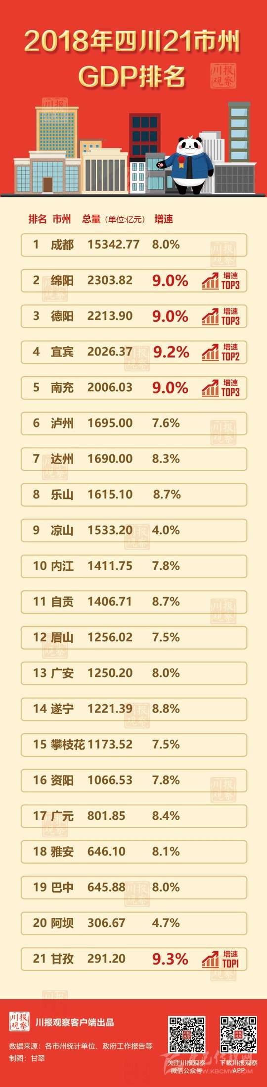 能夠率先拔得頭籌,必然有過人之處。分析發現,綿陽、德陽、宜賓、南充4市,去年的GDP增速都保持在9%及以上。而全省21個市州GDP增速在9%及以上的,總共只有5個,還有一個席位被甘孜占領。