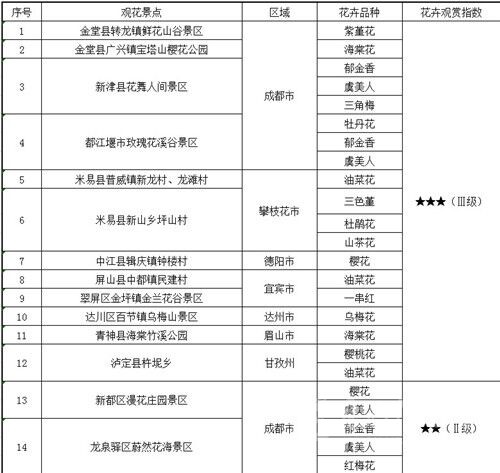 特別是,成都市金堂縣轉龍鎮鮮花山谷景區的紫堇花、金堂縣廣興鎮寶塔山櫻花公園的海棠花、新津縣花舞人間景區的郁金香、都江堰市玫瑰花溪谷景區的虞美人、攀枝花市米易縣普威鎮新龍村、龍灘村的油菜花、米易縣新山鄉坪山村的山茶花、德陽市中江縣輯慶鎮鐘樓村的櫻花、宜賓市屏山縣中都鎮民建村的油菜花、翠屏區金坪鎮金蘭花谷景區的一串紅、達州市達川區百節鎮烏梅山景區的烏梅花、眉山市青神縣海棠竹溪公園的海棠花、甘孜州瀘定縣杵坭鄉的櫻桃花都已進入盛花期。