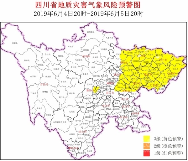 四川在線消息(記者 寇敏芳)6月4日,省自然資源廳發(fā)布全省地災氣象風險預警。結合四川省氣象臺天氣預報情況,6月4日20時~6月5日20時,全省地質災害氣象風險預警等級為3級(黃色預警,注意級),具體結果如下: