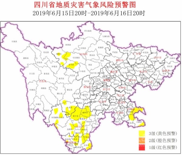 四川在線消息(記者 寇敏芳)6月15日,省自然資源廳發布全省地災氣象風險預警。結合四川省氣象臺天氣預報情況,6月15日20時~6月16日20時,全省地質災害氣象風險預警等級為3級(黃色預警,注意級),具體結果如下: