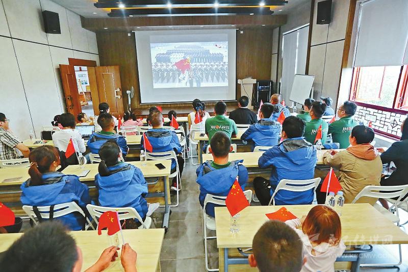 直播中,當鮮艷的五星紅旗在天安門廣場上冉冉升起時,戰旗村黨群服務中心,700多名干部群眾集體起立,唱響國歌。