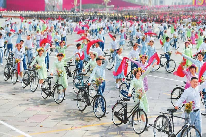 在10月1日上午進行的國慶70周年群眾游行中,上百名少男少女騎著自行車從廣場通過。這個主題為“青春萬歲”的場景喚醒了很多人對20世紀80年代的時代記憶……這是本次群眾游行中的第一個情境式行進。