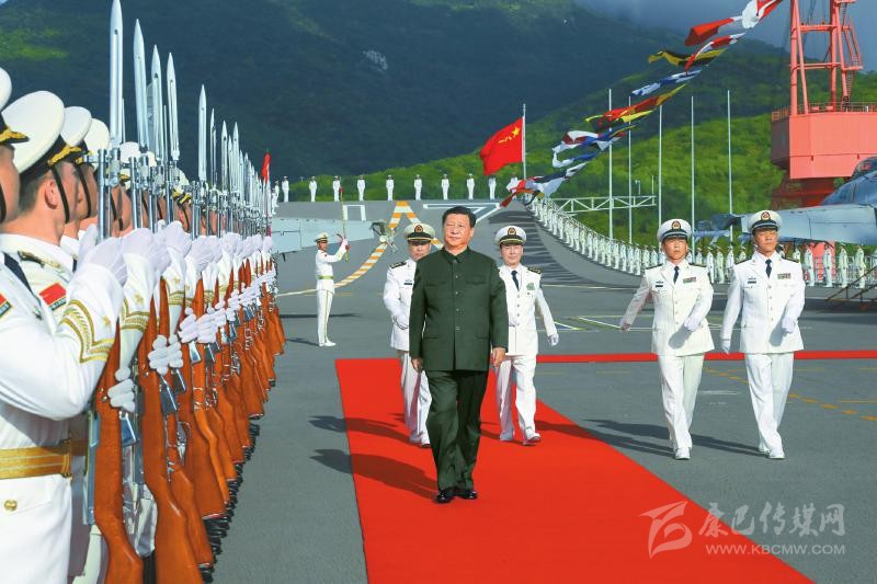 12月17日,我國第一艘國產航空母艦山東艦在海南三亞某軍港交付海軍。中共中央總書記、國家主席、中央軍委主席習近平出席交接入列儀式并登艦視察。這是儀式結束后,習近平登上山東艦,檢閱儀仗隊。 新華社記者 李剛 攝